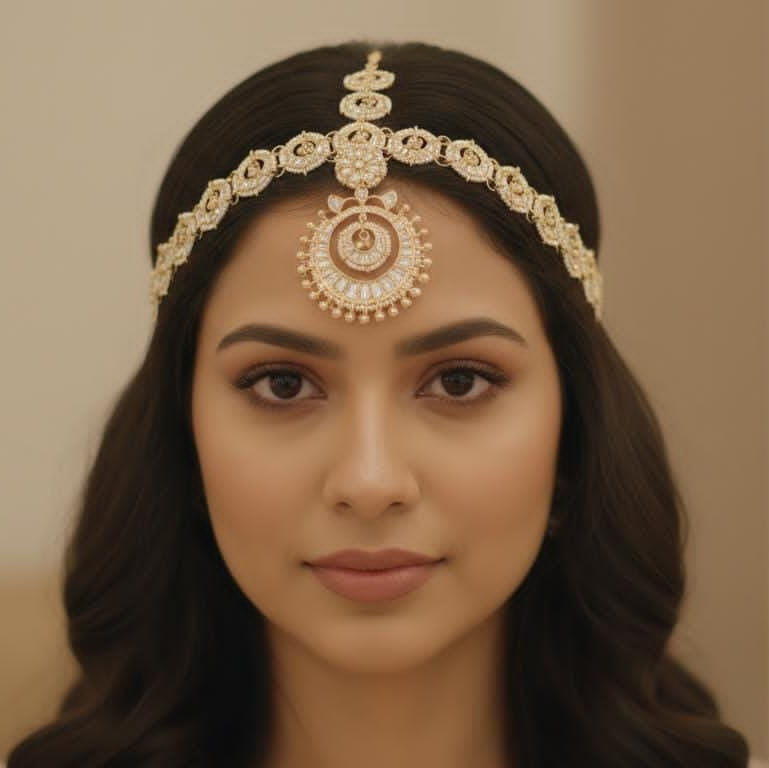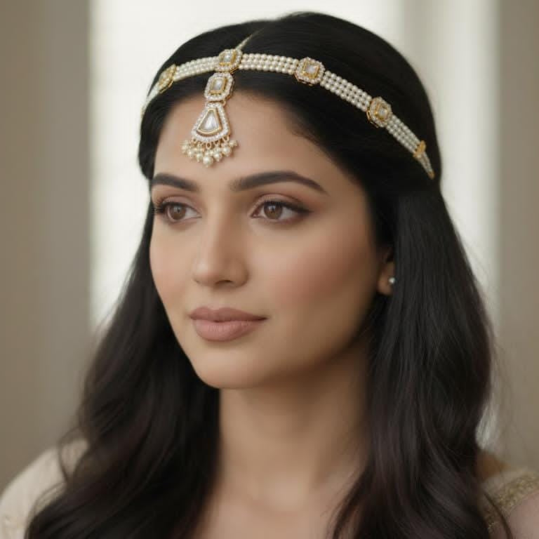 Elegant symmetry meets timeless craftsmanship.The Aarohi Pearl Kundan Matha Patti is designed with layered pearl...