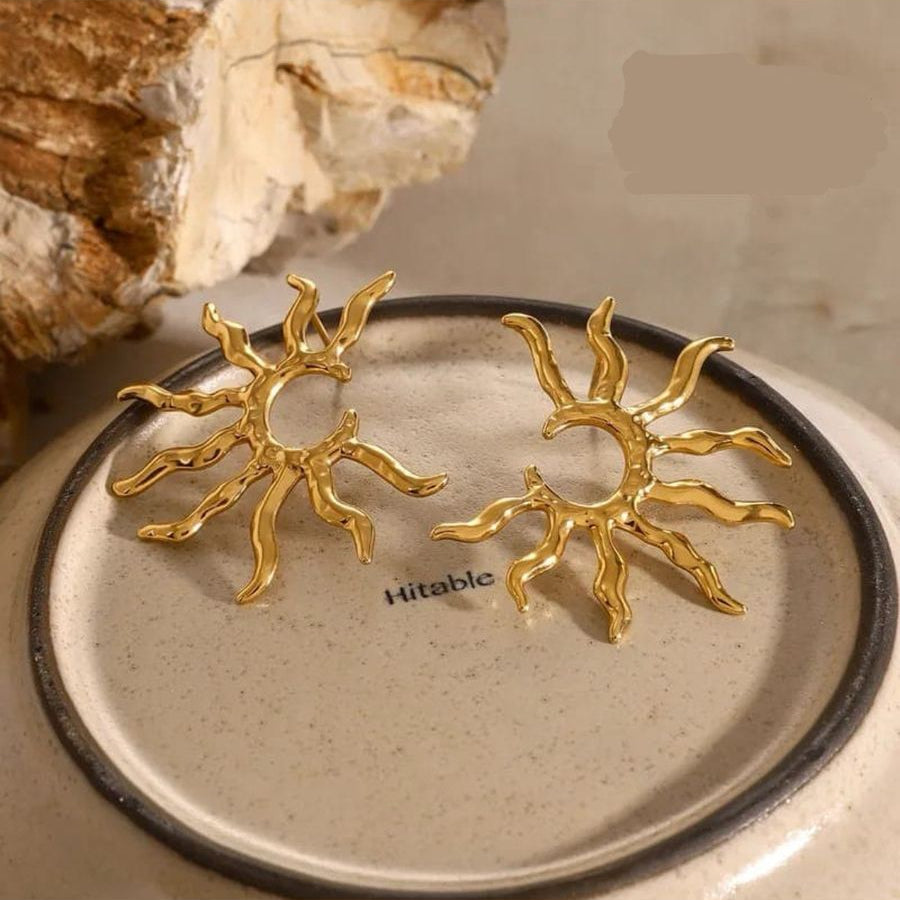 Bold, radiant, and unapologetically artistic — the Solar Bloom Statement Stud Earrings are inspired by the raw energy of the sun. Designed with an organic, molten-gold finish, these earrings capture movement and light in every curve, making them a standout accessory for modern wardrobes.